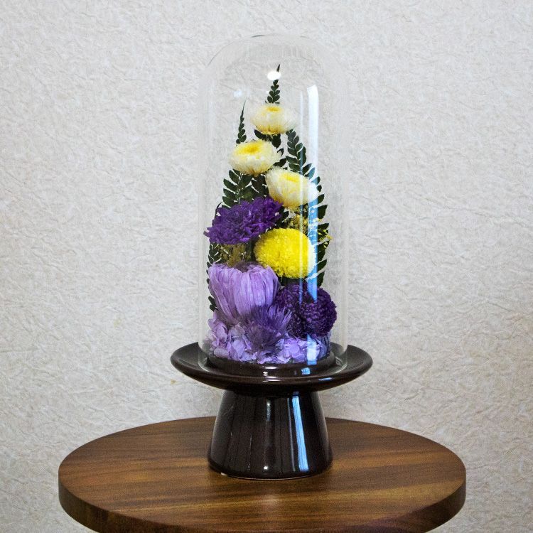 お供え用 プリザーブドフラワーアレンジ作品 ガラスドームで長持ち パープル イエロー