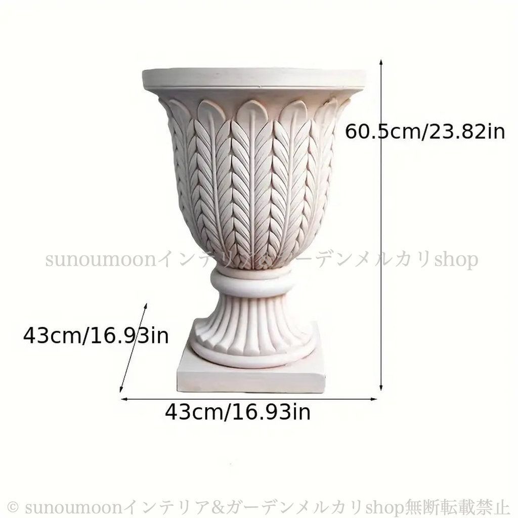 美しい彫刻と細部までこだわったデザインは、どんな空間にも調和し、特にガーデニング愛好者やインテリア好きな方にとって、嬉しい存在です。このプランターにお気に入りの植物を飾ることで、日常の景色がより豊かになり、心地よい癒しの空間を作り出すことができるかもしれません。