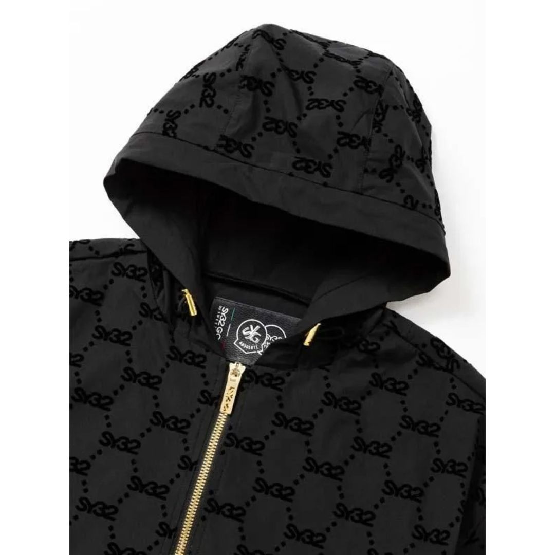SY32のフロッキープリントが施された半袖ハーフジップパーカー。