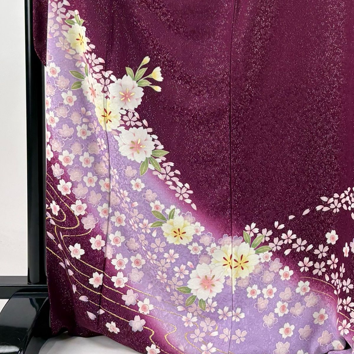 振袖 身丈175 cm 裄丈73 L 袷 桜 流水 銀通し 金彩 赤紫 正絹