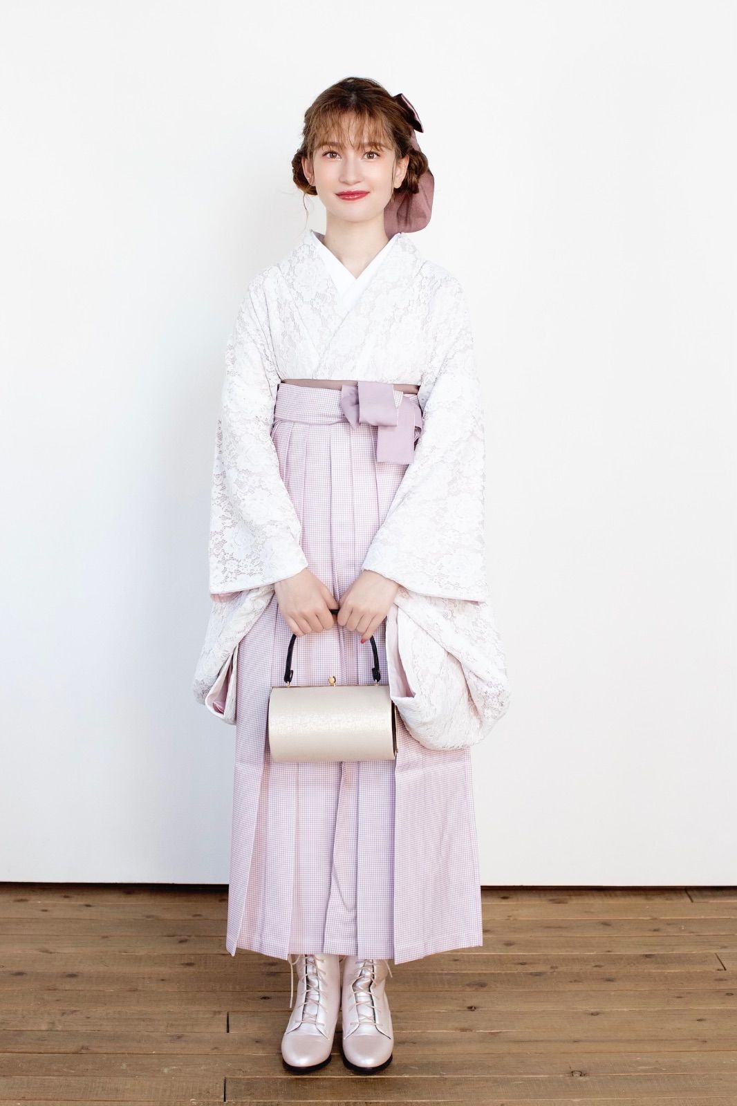 着物ジェンヌ 卒業式 袴3点セット レース二尺袖 白×くすみピンク チェック柄袴