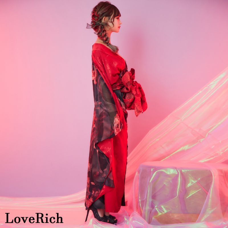 LoveRich ラブリッチ ライン 2点セット バイ 総花柄 サテン&シフォン オフショル ツートン 豪華 帯 花魁 着物 ドレス コスプレ イベント 1308