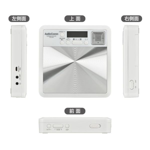 ●語学学習に役立つ機能が充実・繰り返して覚える(リピート/ランダム/A-Bリピート機能)・レベルに合わせてスピード調整(再生スピード11段階コントロール)・すぐに戻せる(5秒・30秒ワンタッチプレイバック)・就寝前でも安心(オフタイマー 10~60分/10分間隔)・らくらくスキップ(10ファイルダイレクトスキップ)●レジューム再生(電源切→入時に前回の続きから再生)機能付き●低音強調機能付きで迫力ある音楽再生ができます●ESP(音飛び防止)機能付き●MP3ディスク再生対応●LINE OUT(音声出力)端子付きで外部アクティブスピーカーと接続できます●乾電池/USB2電源対応(USB電源コード付属)●再生/一時停止、音量調節、スキップができるコントローラー付属●ホールド機能でボタンの誤操作を防止●立てて使えるスタンド付き(本体一体型、2段階調節)●ステレオイヤホン付属●本体カラーはホワイト