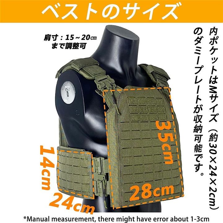 ・「ベストのサイズ」戦術ベストは面ファスナーで調節可能なショルダーストラップとウエストラインがあります。
