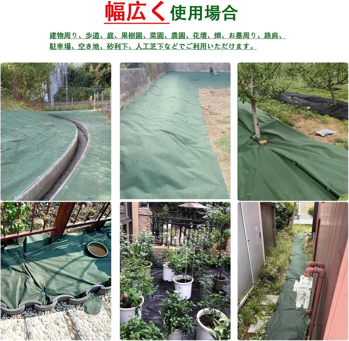 【簡単設置・幅広く使用】防草シートを手軽に切断でき、切り端が綺麗でほつれない。ハサミで自由にカットや、複数枚防草シートを合わせてご利用可能、サイズを簡単に調整して、より便利に設置できます。両面使用可能です。除草剤を使用しないため、環境を汚染しません。人工芝下、砂利下設置、家庭菜園、農業、工事用、建物の周辺(歩道、日光浴場、ウッドデッキ下、庭)、路肩、空き地など幅広くご利用いただけます。