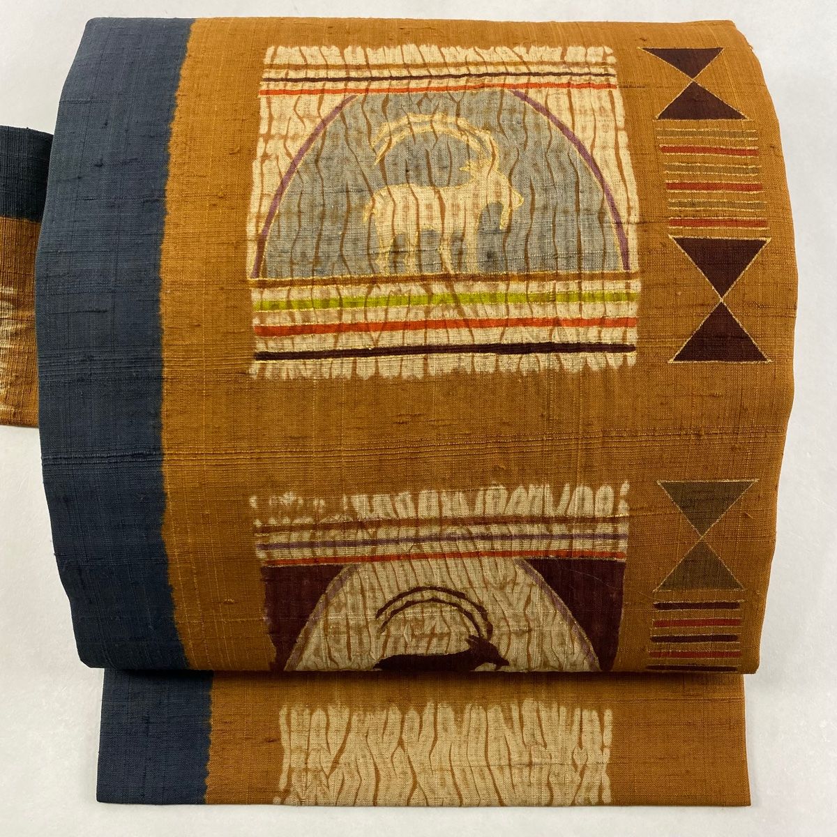 名古屋帯 秀品 紬地 動物 幾何学 金彩 絞り 茶色 正絹