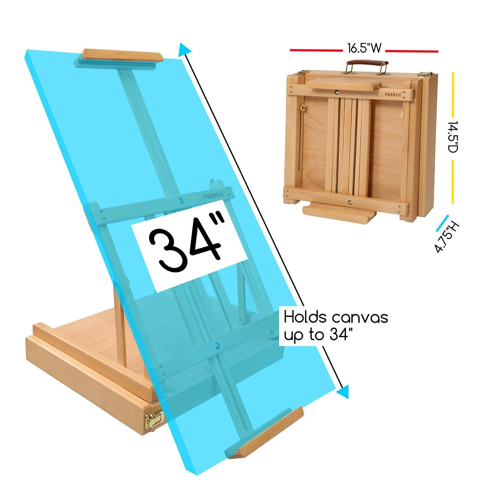 【製品サイズ&高品質】この木製卓上イーゼル、折りたたみのサイズは16.5インチ幅である× 14.5インチ奥行き× 高さ4.75インチ(高さ33.5インチに調整可能)、重量7.5ポンド。組み立てる必要はありません。このデスクトップアートフレームは旅行中に絵が描けるスーツケースです。