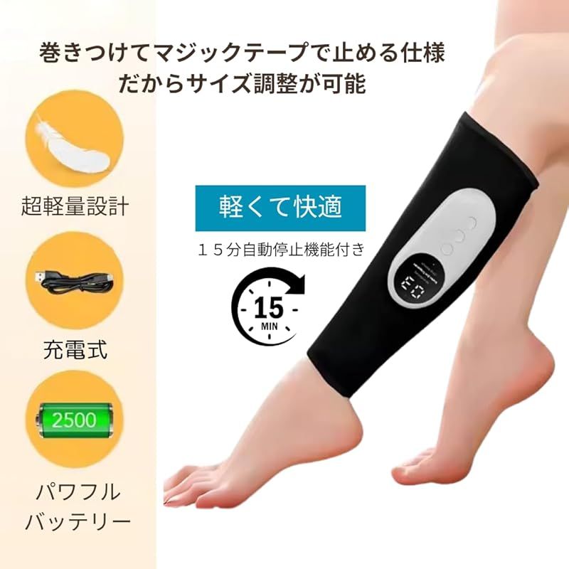 (2個セット) この商品についてはエアバック構造でコードレス、どこでも使用できます。ふくらはぎを程よい空気圧をかけたり、ゆるめたりすることで、リラックスできます。【3モード&3段階調節】3つのモードが付いています、3つの機能はそれぞれ3段階の調節がお好みに応じてモードと強度を組み合わせて自分このみに設定ができます。【ヒーター切・入れ&オートオフタイマー】温熱機能を搭載しており、低温(40°)、中温(45°)、高温(50°)の3つの温度を選択することができます。 自分のニーズに応じて温感機能をオンオフすることができます。15分後に自動で電源が切れるので、寝てしまっても安全です。電源ボタンを2秒間長押しして電源を入れます、操作が簡単です。リモコンには液晶ディスプレイがあり、モードや強度などの情報を表示します。 ?【安心の1年付き】 本製品はお買い上げ日より1年間の国内メーカーが付いております。 万が一の不具合・初期不良などがございましたら、迅速に対応させていただきます。 お困りの際は、メールにていつでもお気軽にご連絡ください。 【ご注意】 修理交換はできません。返品された商品は当社で動作検査を させていただいております。商品に不具合が確認できましたら 返金対応させていただきます。