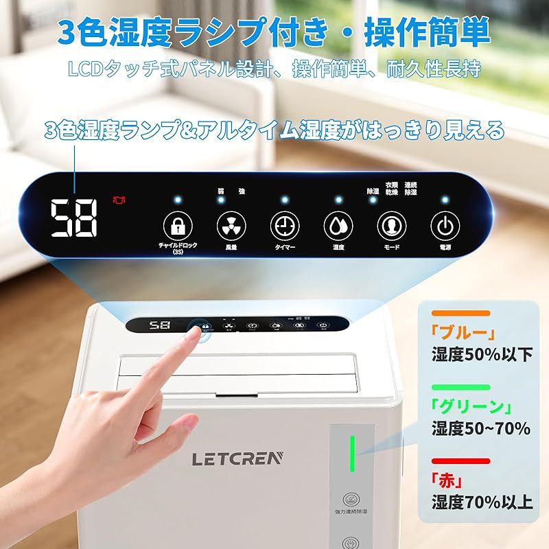 商品名:LETCREN 除湿機 コンプレッサー式 衣類乾燥30畳 静音 パワフル送風 【2025昇級版・12L/日除湿量・10分水出し】 除湿量と除湿範囲アップ 24時間入/切タイマー/湿度センサー 空気清浄除湿器 リアルタイム湿度表示【3つ除湿モード2段階風量】1.