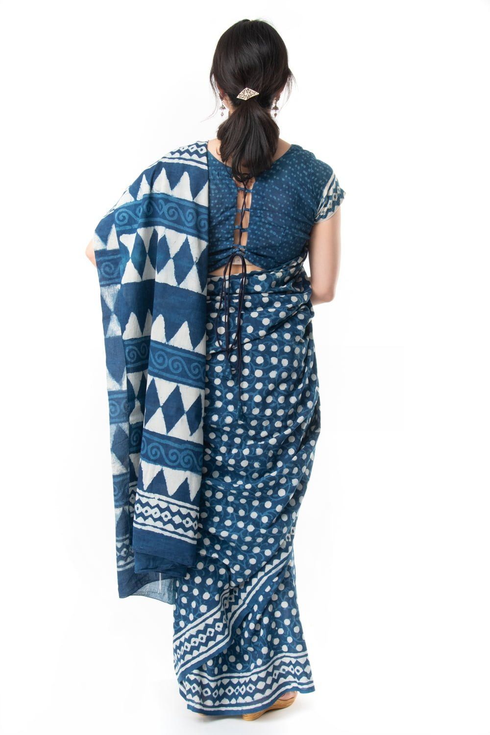 インドの伝統民族衣装『サリー』。こちらのサリーはコットンで有名なラジャスタン州のジャイプルからやってきた上質なコットン素材です。藍染とウッドブロックで素朴ながらに美しい仕上がりになっています。しっかりしたコットン地なので肌さわりもよく、色鮮やかな一品です。色が鮮やかでとても美しいので、着るだけでまわりが明るくなりますね。