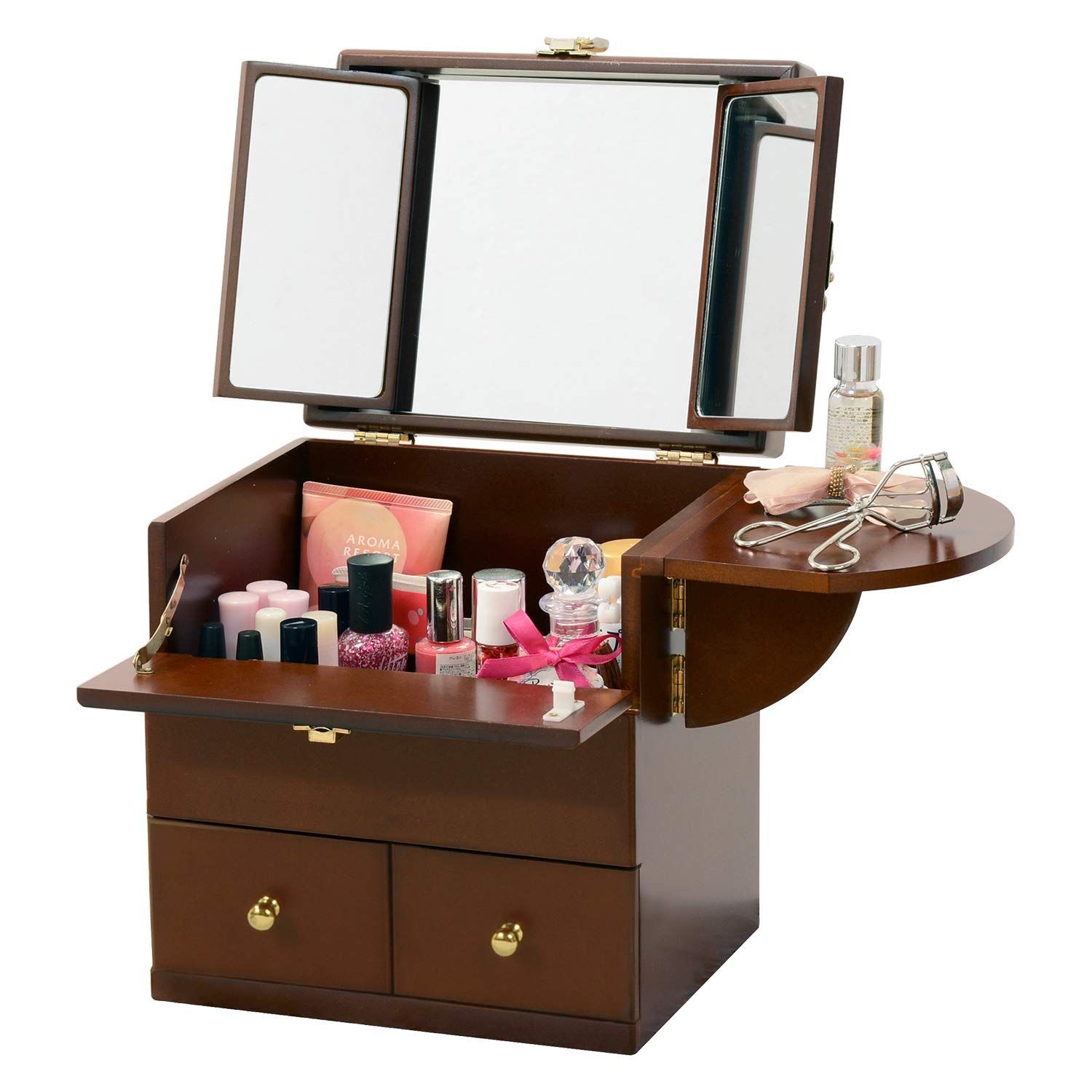 三面鏡がついた大容量のコスメボックス。サイドにバタフライ式のミニテーブルも付いています。