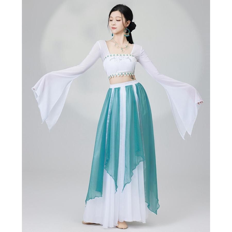 中華 アラビアン 衣装 中華古典舞踊 漢唐 中華宮廷舞踊 西域 敦煌 飛天 チャイナ古典民族ダンス 衣装セット 白 青 ひらひら 飄々 改良 漢