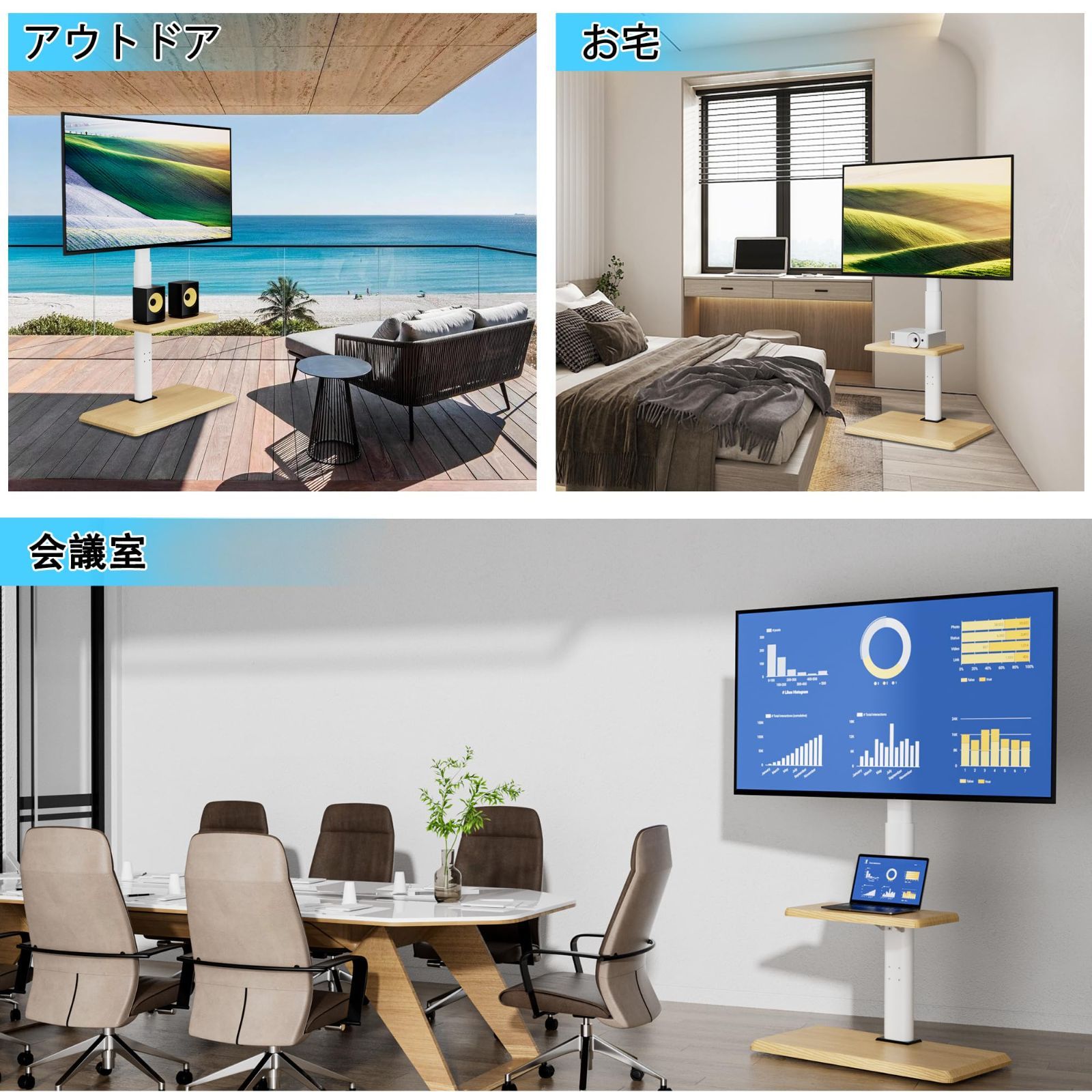 【高さ調節可能】取り付け部中心から床まで、高さがそれぞれ104cm、109cm、114cm、119cm、124cm、129cmに調整できます。異なる身長のユーザーがテレビの高さに対する要求を完璧的に満たし、便利で快適な視覚的な楽しみを実現します。