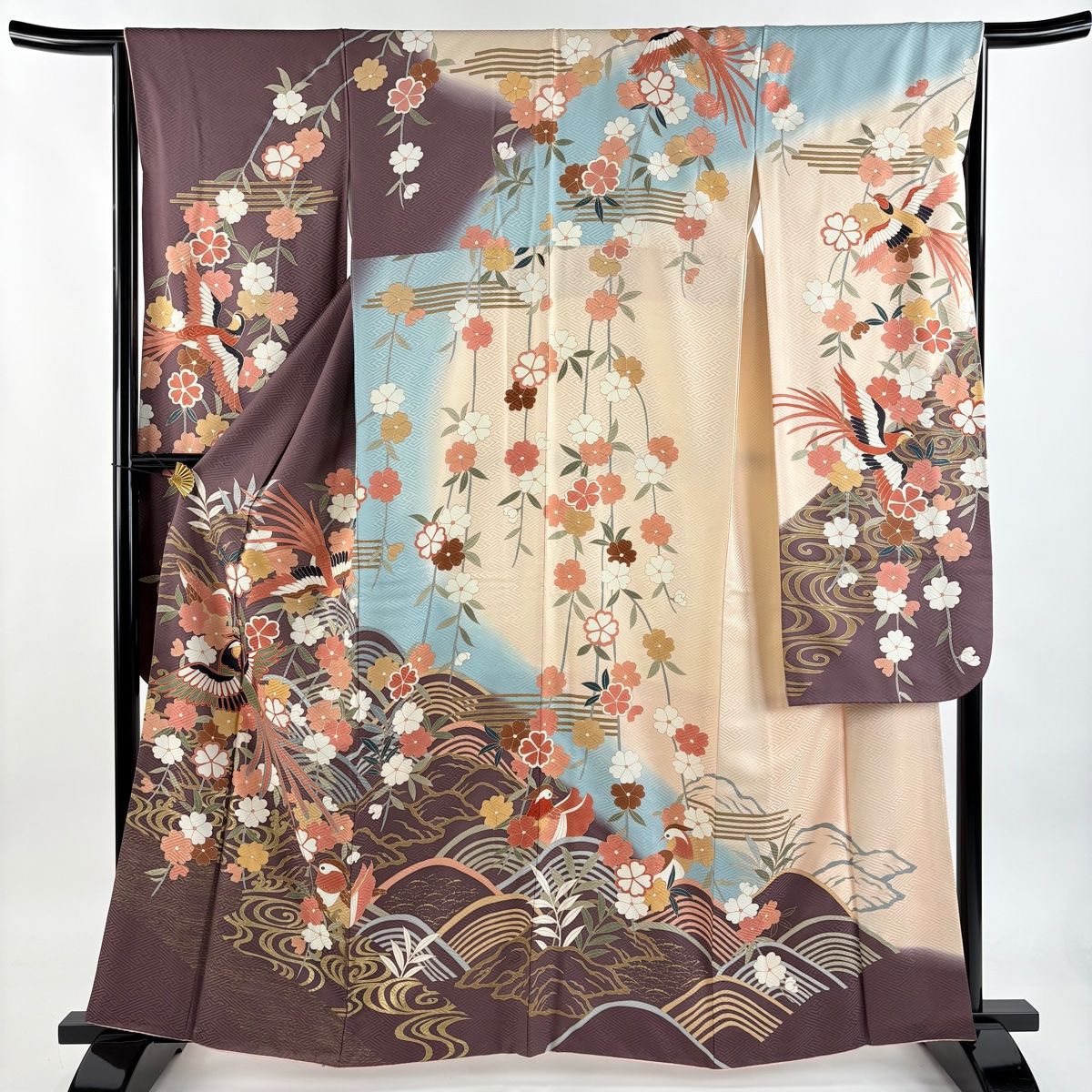 振袖 身丈161.5 cm 裄丈65 M 袷 桜 鴛鴦 金彩 染め分け 紫 正絹 秀品