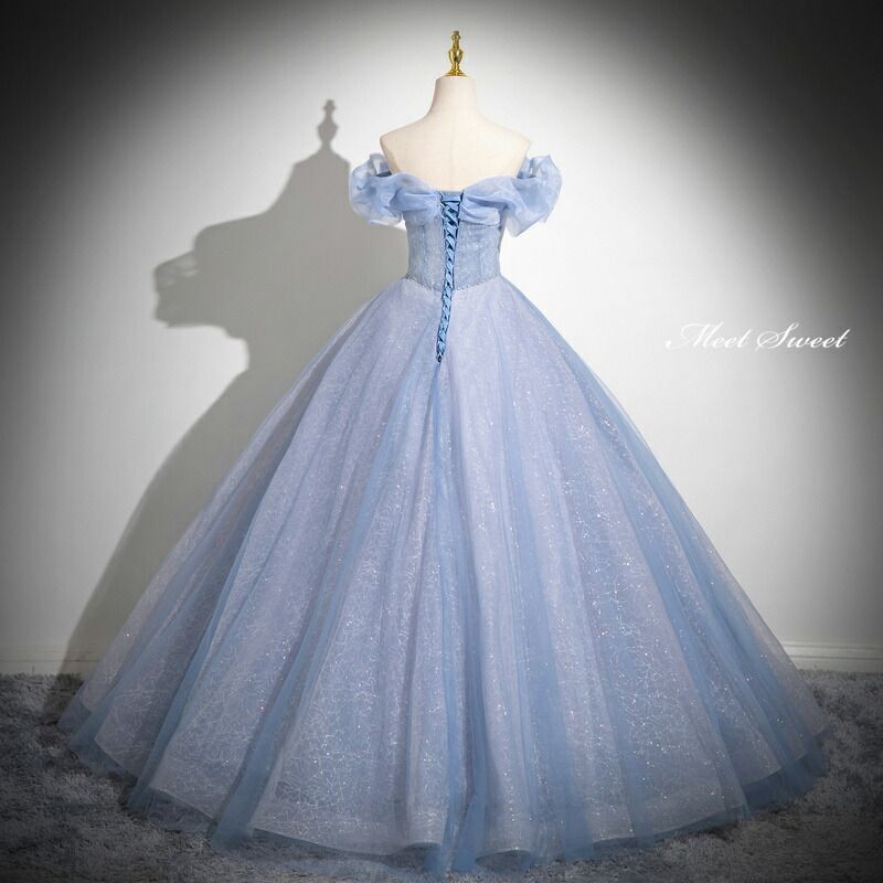 ドレス プリンセスライン ブルー オフショルダー 編み上げ ロングドレス ウェディングドレス 結婚式 二次会 花嫁 前撮り 演奏会 発表会 ステージ衣装 ウエディングドレス パーティードレス ブライダル
