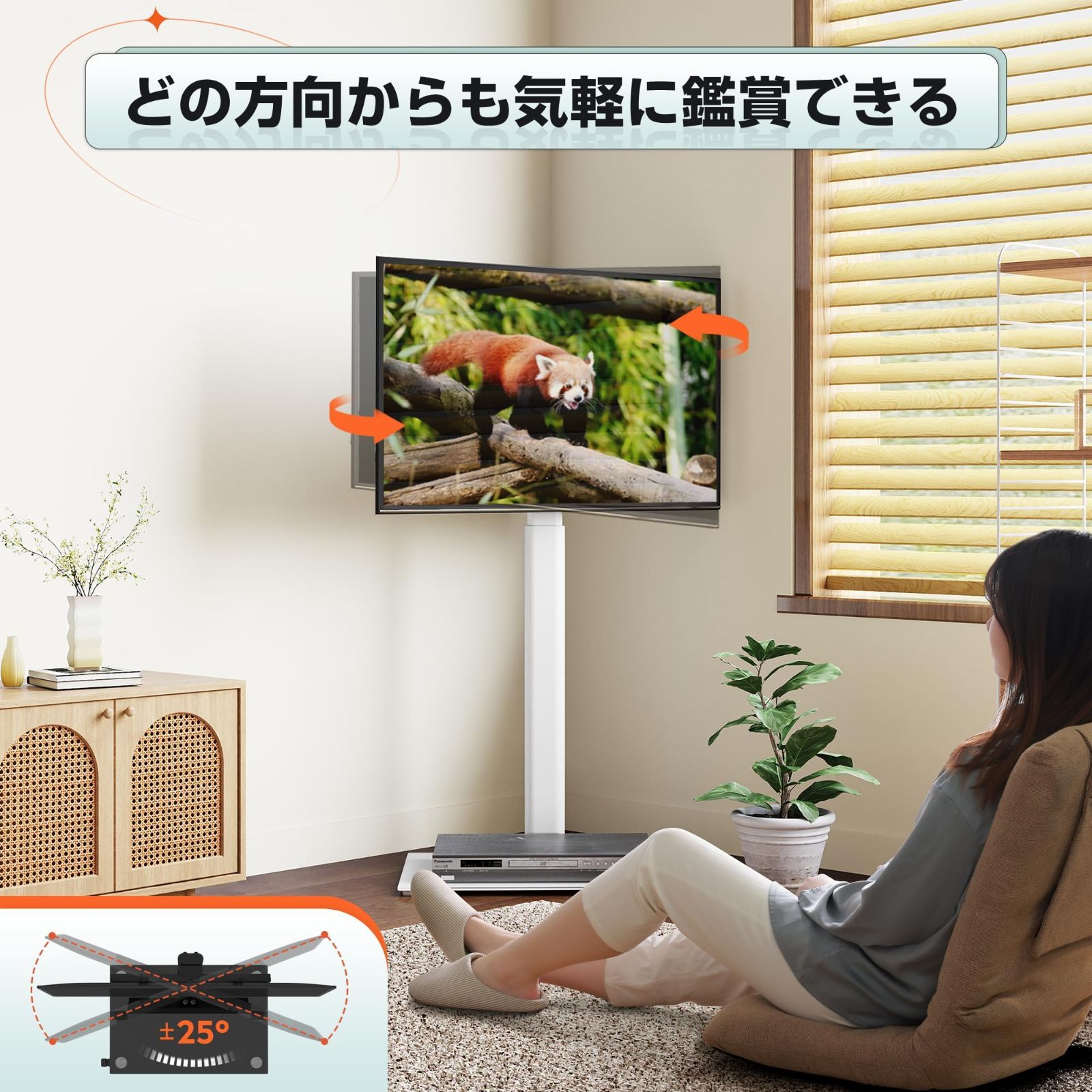 便利的に高さ調節・左右回転可能:高さ3段調節伸縮することで、異なる身長のユーザーがテレビの高さに対する要求を完璧的に満たします。また、左右方向へ±25°回転することができるので、最適な調整角度で調整し、いろんな視角からの観賞を満たします。リビングルームだけでなく、キッチンや寝室に居ても、回転角度によって、素晴らしい瞬間を見逃しません。床座りと座椅子の低い位置に、お昼ご飯時に、家族と一緒に楽しみ時間を過ごします。