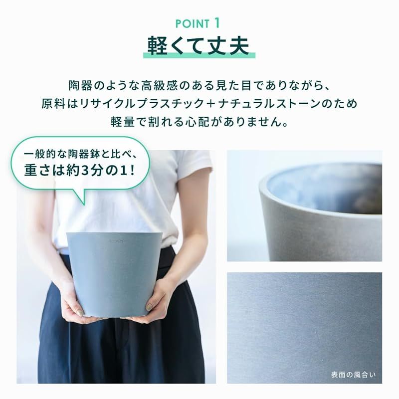 【植木鉢のサイズ】■号数:12号■ サイズ 外径: 35cm 内径: 32.9cm 高さ: 29.5cm ■ 重さ: 2600g ■ 容量:21.70L ■カバー利用:あり■底穴:あり ■鉢皿付き:外径28.9cm、高さ3cm■ 同梱物:植木鉢、鉢皿、鉢底網