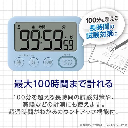 最大100時間まで時間が計れるので、長時間の試験対策や実験などの計測にも使えます。音のON/OFF設定が可能で、タイムアップを光でお知らせします。見やすい角度で自立するスタンドつき。裏面には磁石付きでスチール面に貼りつきます。【めざせ!集中力UP!】タイマー式学習法はやわかりガイドブックつき。時計機能・アラーム機能付。タイムアップ後は、自動でカウントアップに切り替わるので超過時間がわかります。【アラーム】電子音⇔LEDライトの切り替え式/アラーム鳴動時間約60秒【設定時間】カウントダウン時:最大99時間59分50秒最小10秒/カウントアップ時:最大99時間59分59秒【音量】小:約65dB大:75dB(2段階調整が可能)お試し用電池付き(単4乾電池×2本)【検索ハッシュタグ】#ソニック#タイマー#トキ・サポ#100時間タイマー#スタンド付#光ってお知らせ#ライトブルー#青