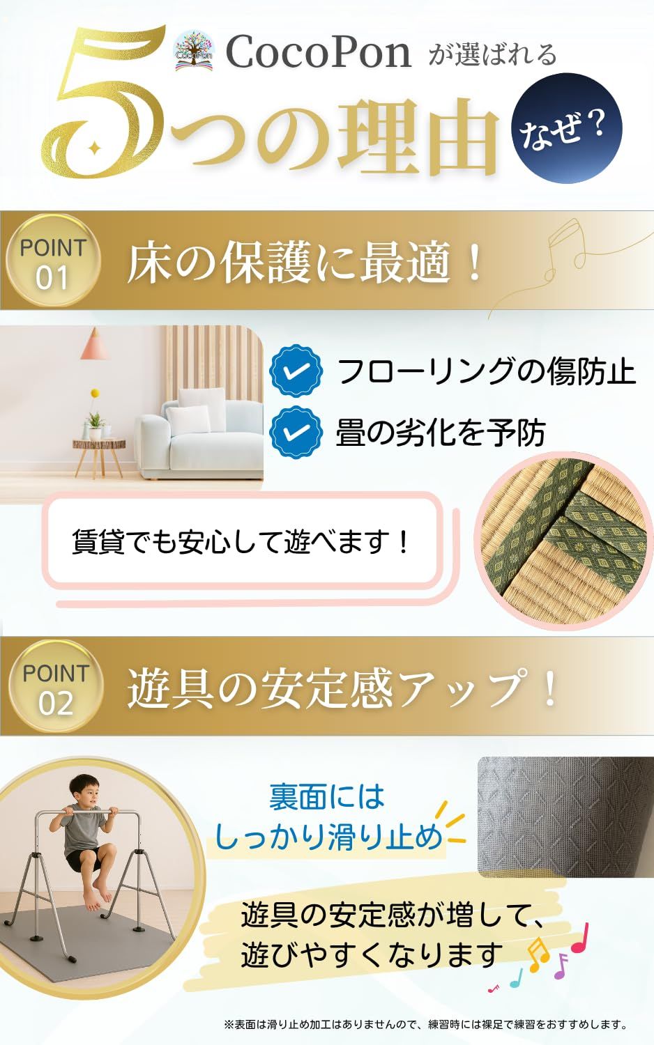 子どもの室内鉄棒やトランポリンがぐらついたりフローリングに跡が付いたりしていませんか? CocoPonの鉄棒マットは、厚さ4