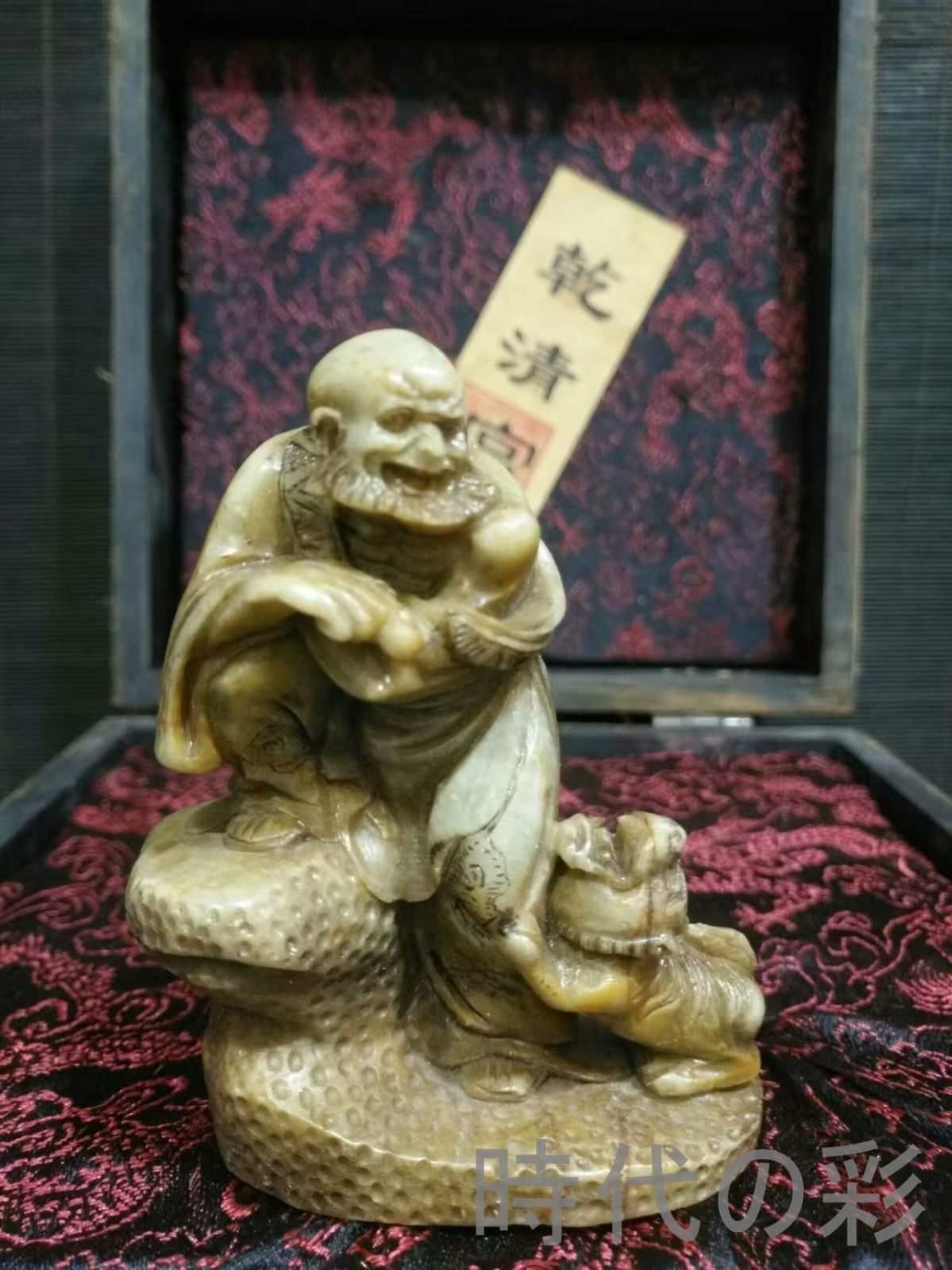 本品は漆器盒に収められた寿山石「伏虎羅漢」で、動的で精緻な造形が特徴です。装飾や収蔵、鑑賞用に適しています。