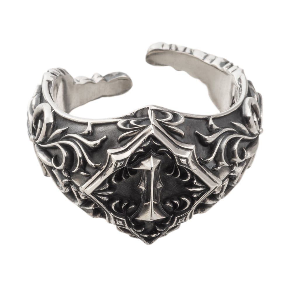 力強く刻まれた「1」の意匠が、揺るぎない願いを象徴する〈ナンバーリング・ワン〉。センターに配された菱形の中に浮かび上がる「1」は、頂点を目指す強い意志を映し出し、指先に確かな存在感を刻みます。リング全体には流麗な唐草模様が立体的に彫り込まれ、光と影が織りなす陰影がクラシカルでありながらモダンな気配を放ちます。さらに内側には、アルテミスキングスの象徴である王冠が唐草をまといながら彫刻され、見えない部分にまで宿る美意識を体感できます。アーム内側にはブランド刻印〈AK〉と〈925〉の品質刻印を配し、確かなクオリティを保証。このリングは、アトリエの熟練職人が一点ずつ丹念に仕立てた逸品。緻密な造形と重厚なシルエットは、単なる装飾を超えて“現代の小さなアートオブジェ”としての存在感を纏います。