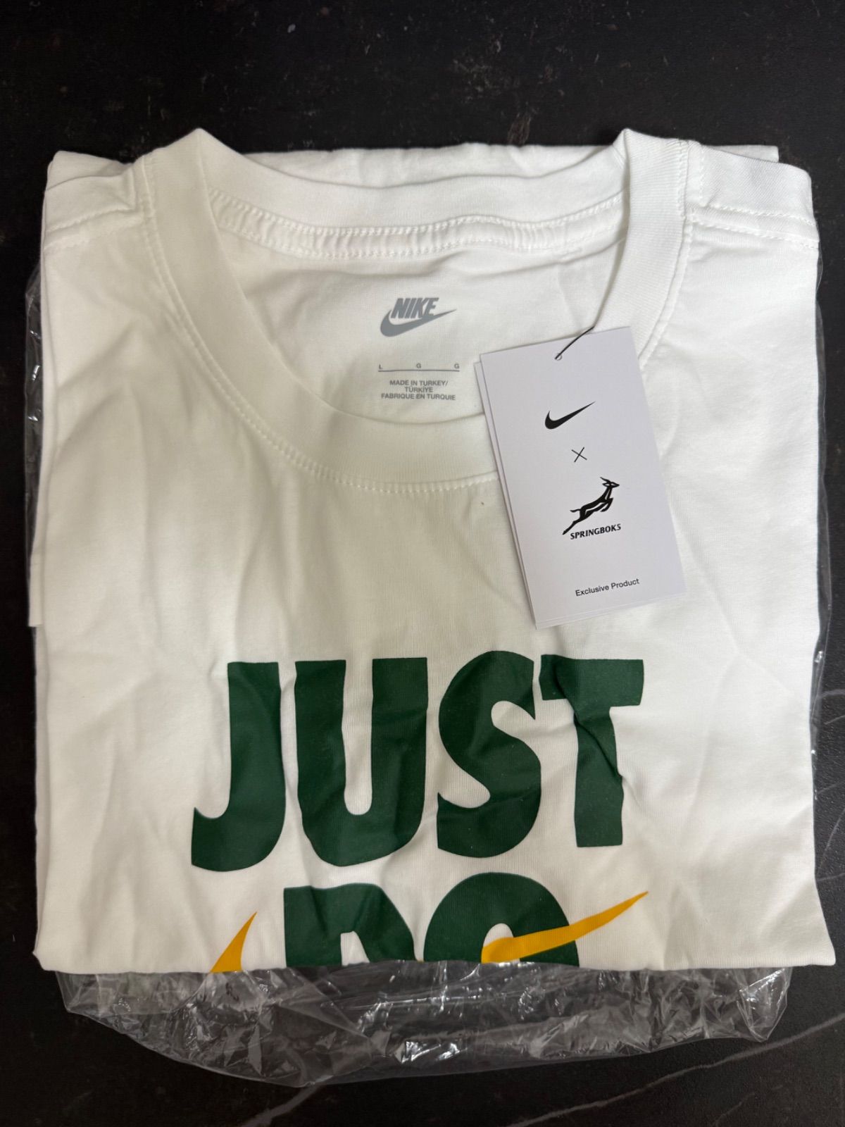 クリーンなホワイトを基調とし、フロントには「JUST DO IT」の文字とスプリングボクスのエンブレム、ナイキのスウッシュロゴが施されています。普段使いはもちろん、スポーツ観戦や、カジュアルなコーディネートのアクセントとしても最適なアイテムです。