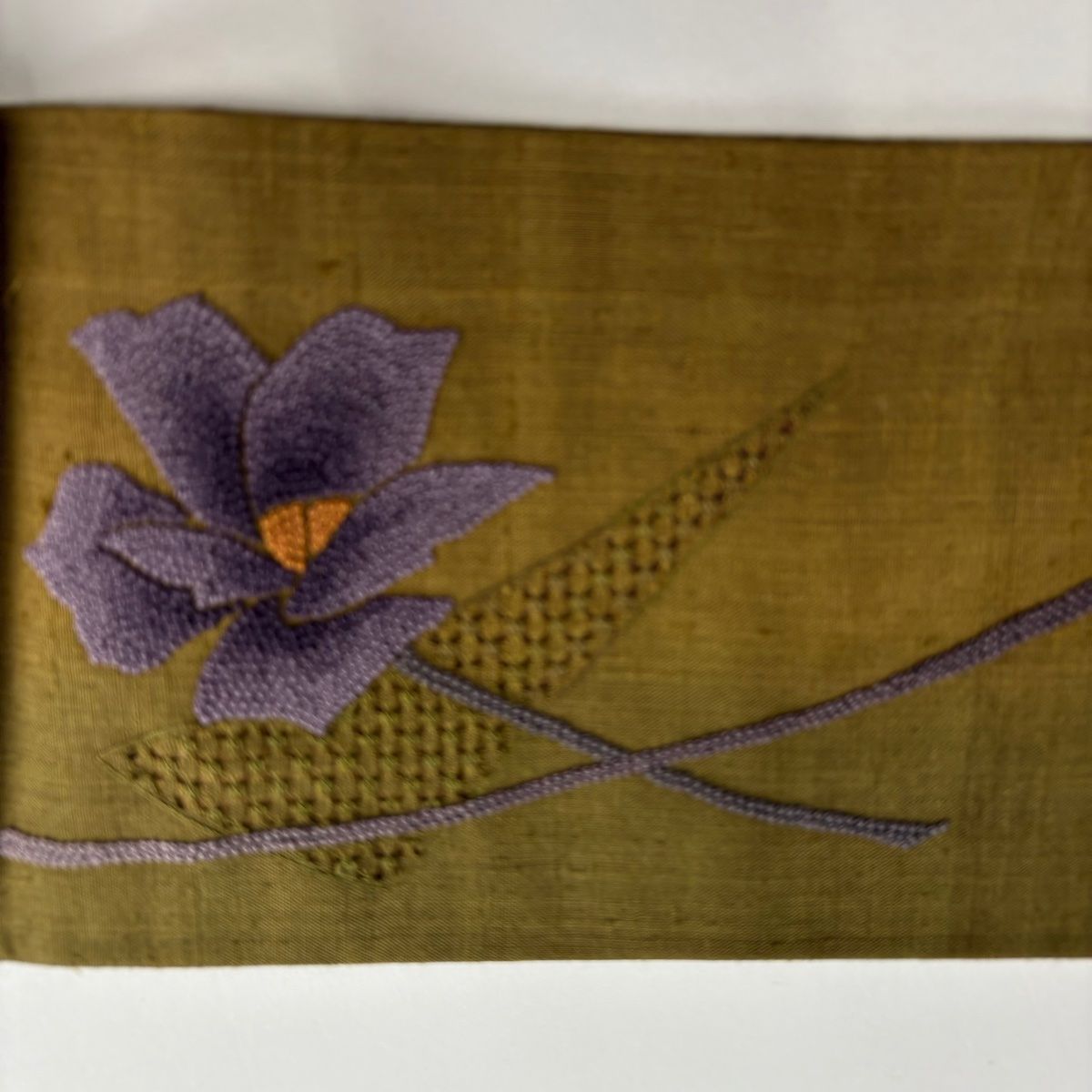 名古屋帯 秀品 紬地 花 刺繍 茶緑色 正絹