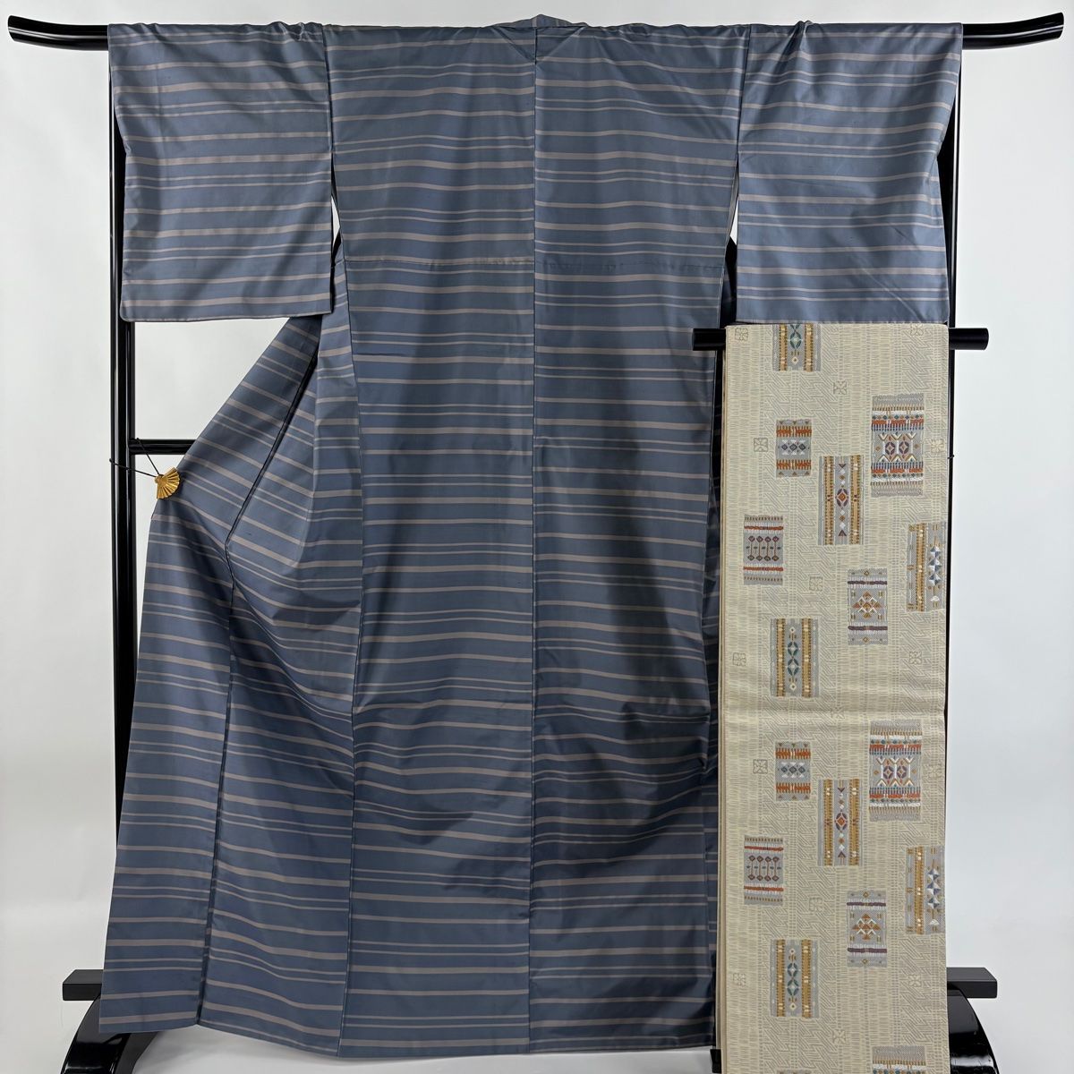 紬 身丈169 cm 裄丈67.5 L 袷 袋帯セット 横縞 青灰色 正絹 秀品