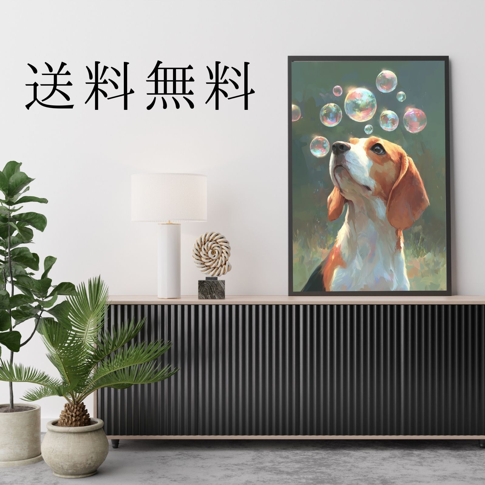 かわいいビーグル犬が、空に舞うシャボン玉を見つめる愛らしい瞬間を切り取ったアートポスターです。