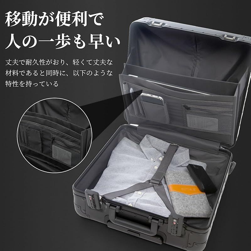 【素材】キャリーケースの材質は オールアルミ合金ボディ+アルミフレーム。特にアルミボディが洗練されたイメージでcool。メタル素材ゆえに強度は折り紙付き。長持ちできます。メタリックボディでルックスも美しく、見た目の高質感があるのもいいところ。コーナーにもプロテクターがつきまして、衝撃に防ぎます。