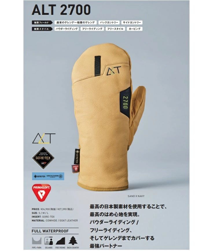 ボリュームグラブス初となる、レザーミトンの誕生です。ALT 2500 PLUSとALT 3000 PLUSをベースにした、こ の二つのグローブの中間に位置するグローブです。手の甲には最高級のCOWHIDE(牛革)、手の平には強 度の高いGOAT LEATHER(山羊革)を使用し、中綿には最高の保温性と透湿性を誇るPRIMALOFT® GOLD を採用しました。手首の部分も最新のデザインを採用することで、手首へのストレスはなく、快適。グローブの 内側や鼻拭きに至るまで、最高級の日本製素材をふんだんに使った、贅沢で快適なグローブに仕上げました。 もちろんGORE-TEXインサートを使用し、防水・透湿も最高レベル。Gore plus warm technology採用で、 ワンランク上の暖かさを提供します。
