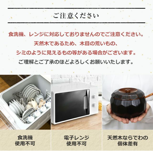 食洗器、レンジに対応しておりませんのでご注意ください。木製のおひつはすべて天然木であるため、木目が荒かったり、シミなどがある場合がございます。あくまでも「天然木のならではのよさ」でありますので、ご理解とご了承のほどよろしくお願い致します。