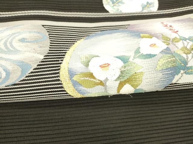 平和屋着物 夏物 西陣 都織物謹製 絽綴れ 八寸名古屋帯 手おり櫛織 流水草花文 黒地 金銀糸 証紙付き 正絹 cm