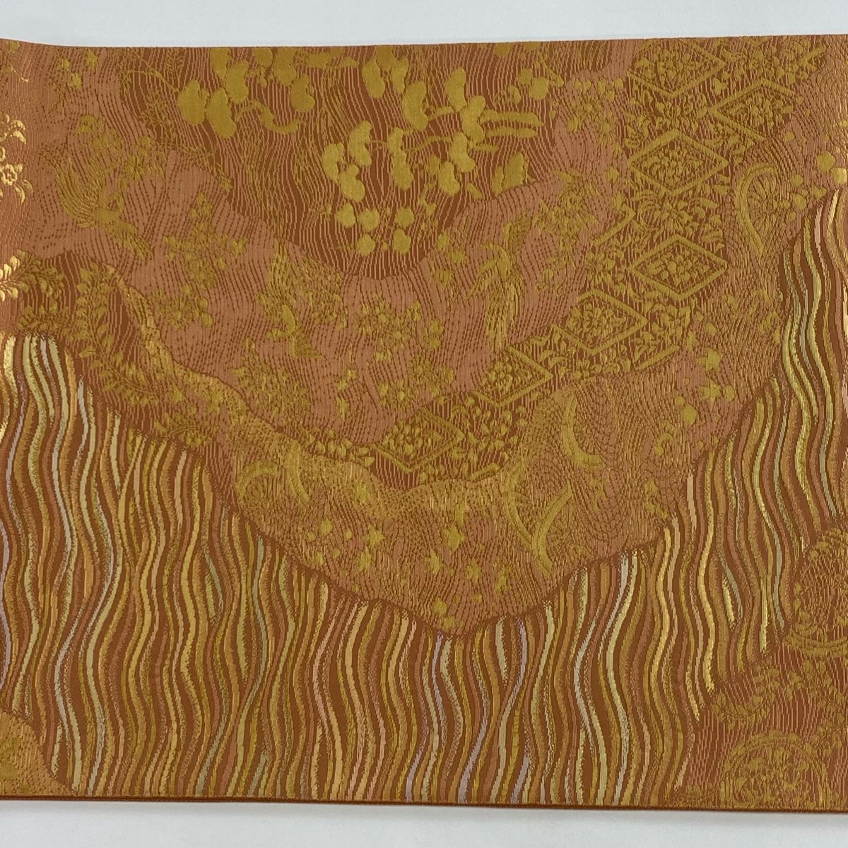 袋帯 秀品 箔屋清兵衛 落款 西陣織 花鳥 源氏車 箔 オレンジ 六通 正絹