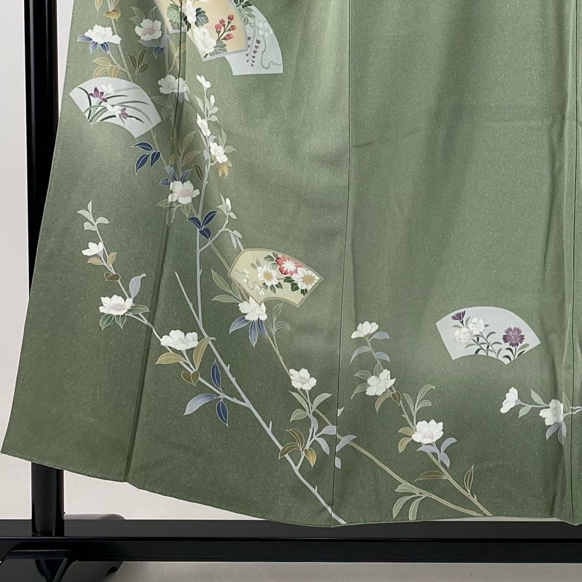 訪問着 身丈153 cm 裄丈65 M 袷 ますいわ屋 扇面 枝花 裾ぼかし 灰緑 正絹 秀品