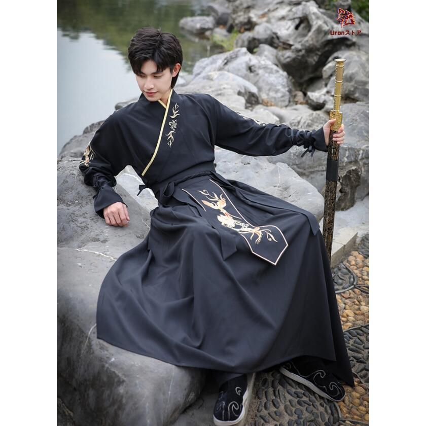 職人製作 チャイナ服 中華コスプレ衣装 メンズ漢服 男性 大人中華服 唐装 上下セットアップ おしゃれ チャイナ衣装 黒に金フェニックス刺しゅう 中国
