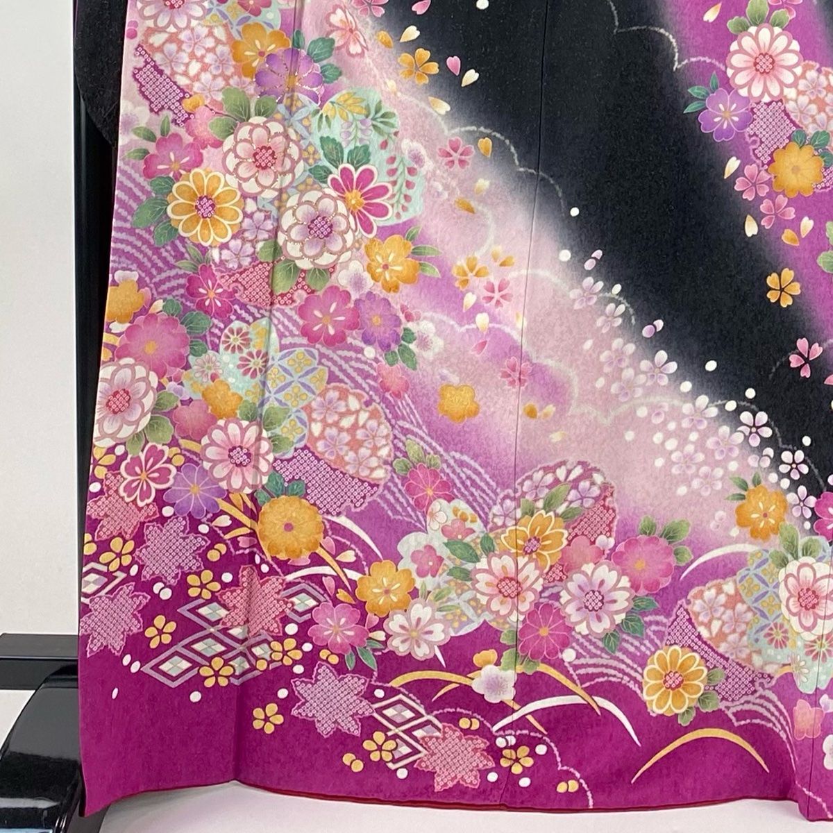 振袖 身丈169 cm 裄丈70 L 袷 雪輪 草花 箔 金通し 黒 正絹