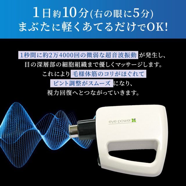 アイパワー, 超音波治療器, 視力回復, 疲れ目, 眼精疲労, 近視抑制, マイクロマッサージ, 視力改善機器, 眼科医監修, 高度管理医療機器, 日本製, 家庭用医療機器