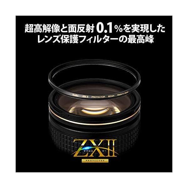 長年フィルターを作り続けてきたフィルターメーカー、ケンコー・トキナーが2016年にリリースした、「フローティングフレームシステム」採用のZX(ゼクロス)シリーズは、ガラスへの負荷を抑える画期的なフレームシステムにより、極めて高い平面性を実現しました。|「ZX IIプロテクター」|は、その「フローティングフレームシステム」を進化させ、さらなる超高解像を実現した、究極のレンズ保護フィルターです。|フレームシステムのみならず、コーティングも刷新。新開発「ZR01(ゼロワン)コート」の採用で、面反射率0.1%のを達成。|写真の画質に何も加えず、描写はありのまま。いわば光をそのまま採り入れる空気のようなフィルター、それがZXIIプロテクターです。| 製品特長 | 進化した超高解像版フローティングフレームシステム|ガラスへの負荷を限りなくゼロに近づけ、レンズ本来の描写力を存分に引き出す「フローティングフレーム」がさらに進化しました。|ガラスのゆがみを極限まで抑え、更に高精度研磨により従来機種を凌駕する平面性と超高解像を実現しました。| 超低反射の新開発ZR01コート&高透過率光学ガラス採用で|面反射率0.1%|を実現。|ZX IIプロテクターのレンズコーティングには新開発の「ZR01コート」を採用。面反射0.1%の超低反射を実現しました。|夜景などのシーンで発生しやすい、フィルター装着によるフレアやゴーストなどのデメリットを抑え、レンズを守りながら性能を最大限に発揮します。| メンテナンス性抜群 超強力反射の撥水・撥油コート|強力な撥水・撥油コートにアウトドアシーンの撮影でも安心。水や汚れが付着してもさっと拭取って撮影を続行できます。| 操作性を向上させるドライルーブ処理&ローレット加工|フィルター取り付け時にレンズへの噛み込みを軽減させる「ドライルーブ(潤滑)処理」とフィルター着脱時に指の引っ掛かりを良くする「ローレット加工」でつけやすく、外しやすいフィルターを実現しました。| 安心の日本製|ZX IIプロテクターは、安心の国内製造です。||超高解像と面反射0.1%を実現した、「ZXIIプロテクター」|ガラスへの負担、ゼロへ|ケンコー・トキナーの光学技術の結晶、「フローティングフレームシステム」を採用したZX[ゼクロス]シリーズは2016年に誕生。ガラスへの負荷を抑える画期的なフレームシステムにより、極めて高い平面性を実現した。そして2021年3月、フローティングフレームシステムを進化|させ、さらなる超高解像を実現した、究極のレンズ保護フィルター「ZXIIプロテクター」を発売。新たに「ZR01(ゼロワン)コート」を採用することで、面反射0.1%|の超低反射も達成。画質に何も加えず、描写はありのまま。いわば光をそのまま採り入れる空気のようなフィルター、それがZXIIプロテクターだ。|ガラスの平面性を保持し、超高解像に寄与|さらなる超高解像を実現 「進化版フローティングフレームシステム」|一般的なフィルターは金属のリングでガラス面を押さえるため、ごくわずかな歪みがガラス面に生じる。しかし、ZX[ゼクロス シリーズはガラスへの負荷を抑えた画期的な構造の「フローティングフレームシステム」を世界で初めて採用した。|ZXIIプロテクターは、高精度研磨によりガラス単体で干渉縞(ニュートンリング)1本以下|という高い平面精度を達成。また、フローティングフレームシステムに使用している特殊弾性緩衝剤と枠の構造を進化させ、さらなるガラスの平面性と超高解像を実現している。|フィルター装着によるフレアやゴーストの発生を低減|ZXIIから採用された「ZR01コート|」により、面反射0.1%|の超低反射を実現。フィルター装着によるフレアやゴーストの発生を抑え、レンズ性能を最大限に発揮する。 上の画像は強い光源が近くにある状況においてフィルター未使用、ZXIIプロテクター、一般的な保護フィルターの3つで比較撮影したもの。一般的な保護フィルターでゴーストが発生した部分を拡大して比べてみると、ZXIIでは圧倒的にゴーストが軽減されていることがわかる。|_|高級フィルターにふさわしい、使いやすさと高画質を追求する充実の機能|撥水・撥油コーティングで水や油を強力に弾く|ガラスのコーティング最終層に耐久性の高い撥水・撥油コーティングを成膜。水や油を強力に弾き、指紋などの汚れが吸着しても簡単に拭き取ることができる。水辺での撮影や雨天時でもストレスなく撮影でき、日頃のメンテナンスも簡単だ。|潤滑処理&ローレット(すべり止め)加工|レンズ取付ネジに潤滑加工(ドライルーブ処理)を施すことで、フィルターの着脱を滑らかにし、レンズへのみ込みを軽減させている。|高透過率光学ガラス|透明度の高いガラスを使用。高純度の原料を溶解してつくられており、可視域から赤外域に至る広い波長域で高い透過率を誇る。|ガラス外周墨塗り加工|フィルターガラスの外周に墨塗り加工を施すことで、内面反射を極限まで低減している。逆光撮影時のフィルター装着によるフレアー