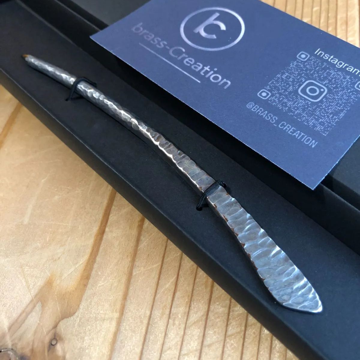 チタンを火とハンマーを使って製作した、ロックシリーズの先端までテーパーに設計されたアールタイプ、微妙なアールがついておりますのでヘアスタイルがまとまります。岩の質感を再現した絵の様なアート的デザイン、シンプルだけど他にはない作品です。純チタン製なのでとにかく軽く、頑丈で使いやすい作品です。