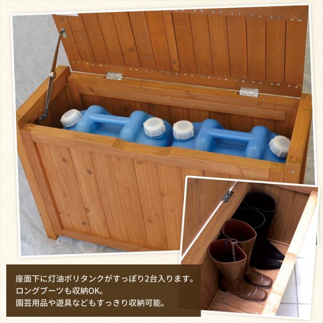 ポリタンク(灯油)18lが2個収納できるサイズの木製のボックスベンチです。