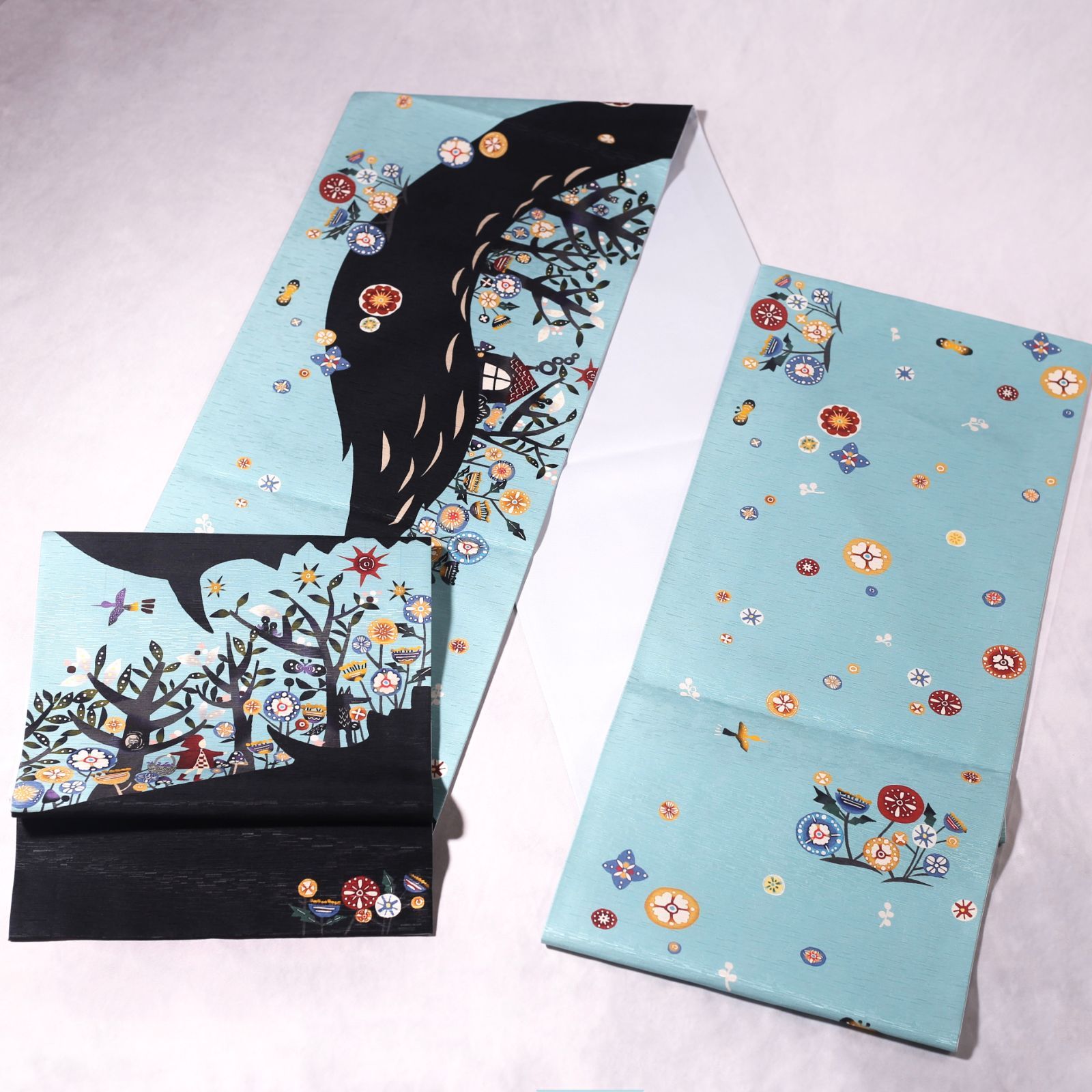 再入荷 . WAKKA 正絹 京袋帯 キャ~ 水色 お仕立て上がり 着物 帯 カジュアル 一重太鼓 OB-15