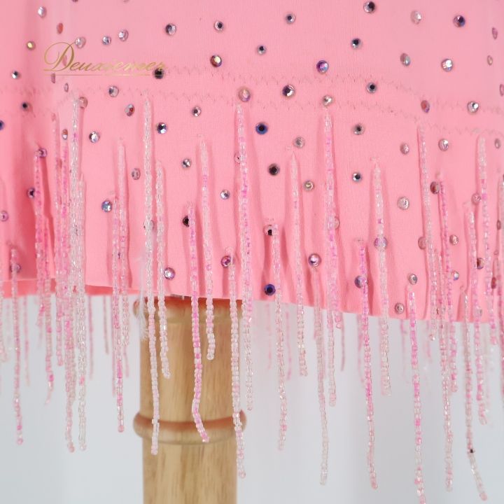 社交ダンス 衣装 ラテン ドレス ワンピース ピンク系 長袖 デモ 競技 ダンス パーティ 発表会 ミニ丈 ビーズ 明るいピンク 華やかビーズ ゆれる裾 おしゃれ エレガント パーティー服 ショートドレス ダンス衣装 競技用 レディース ストレッチ