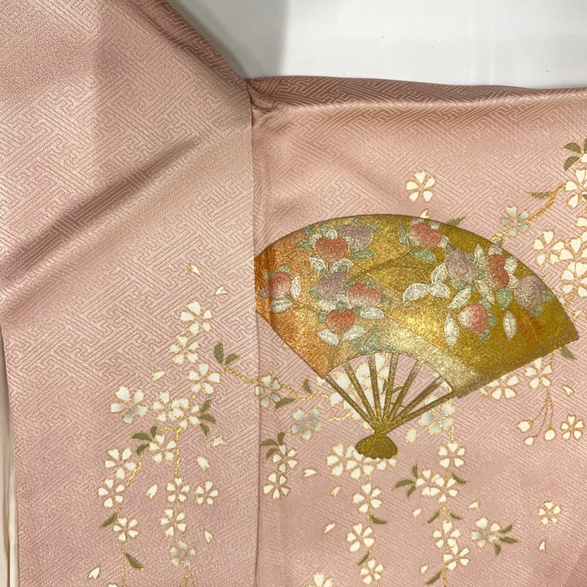 訪問着 身丈160 cm 裄丈63 S 袷 扇 枝垂れ桜 金銀彩 ぼかし 薄ピンク 正絹 秀品