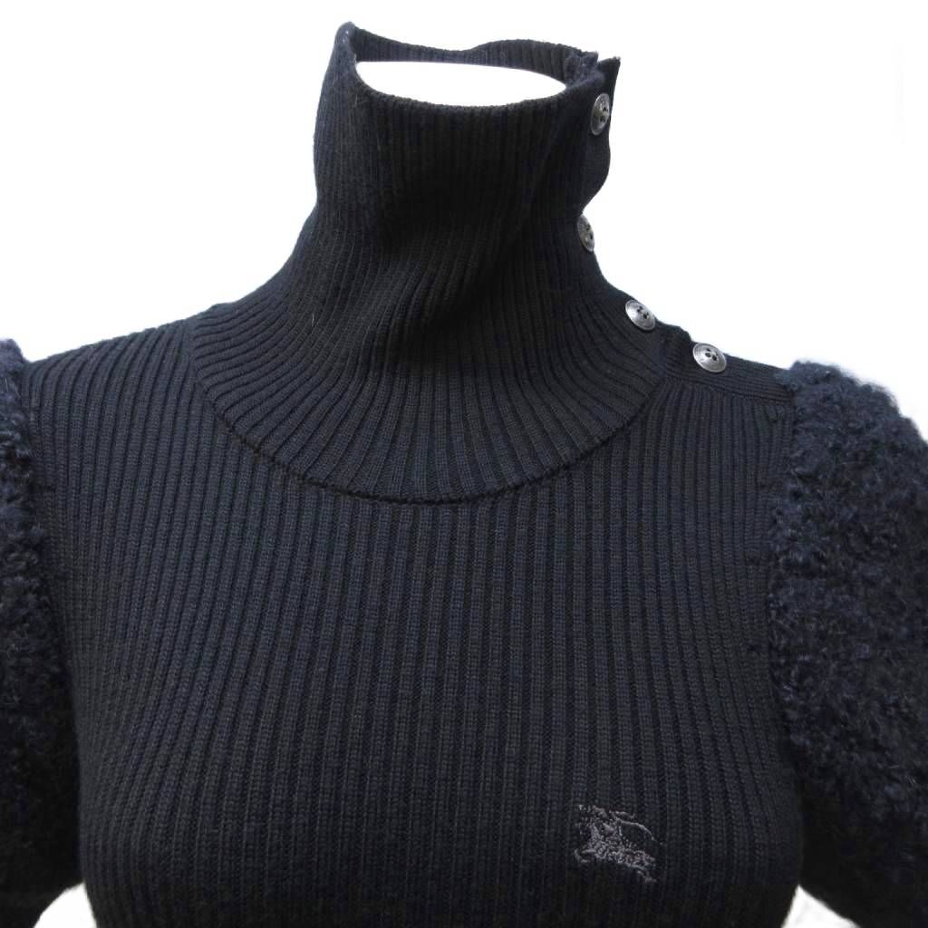 バーバリーブルーレーベル BLUE LABEL ハイネックワンピース パフスリーブ ボア ブークレーニット ポニー刺繡 黒 ブラック 38 約M IBO 79